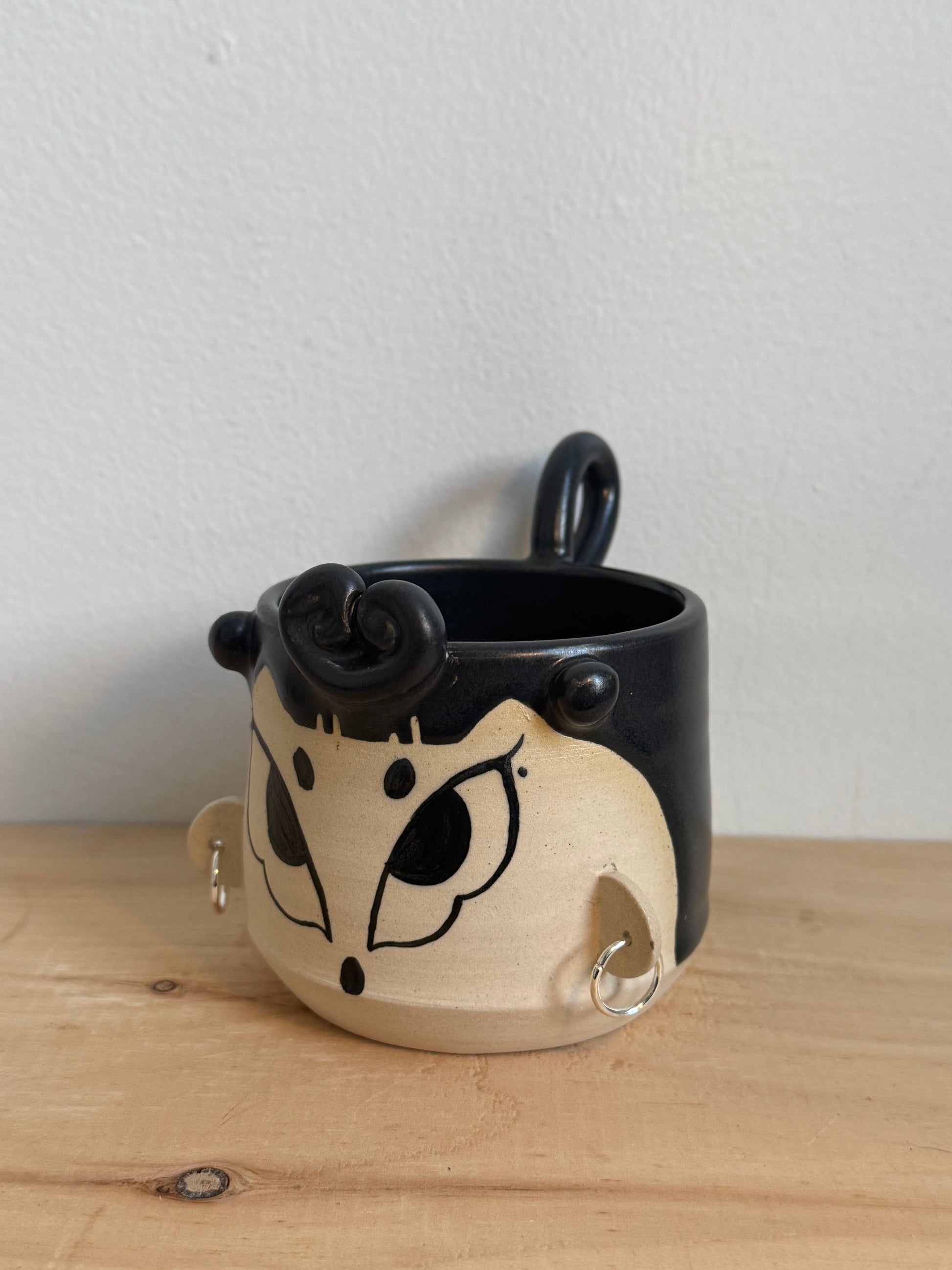 Holds around 10 oz of liquid. Adorned with stainless steel hoops and stainless steel piercing or bead. Hand wash only and do not use in the microwave (due to the metal).